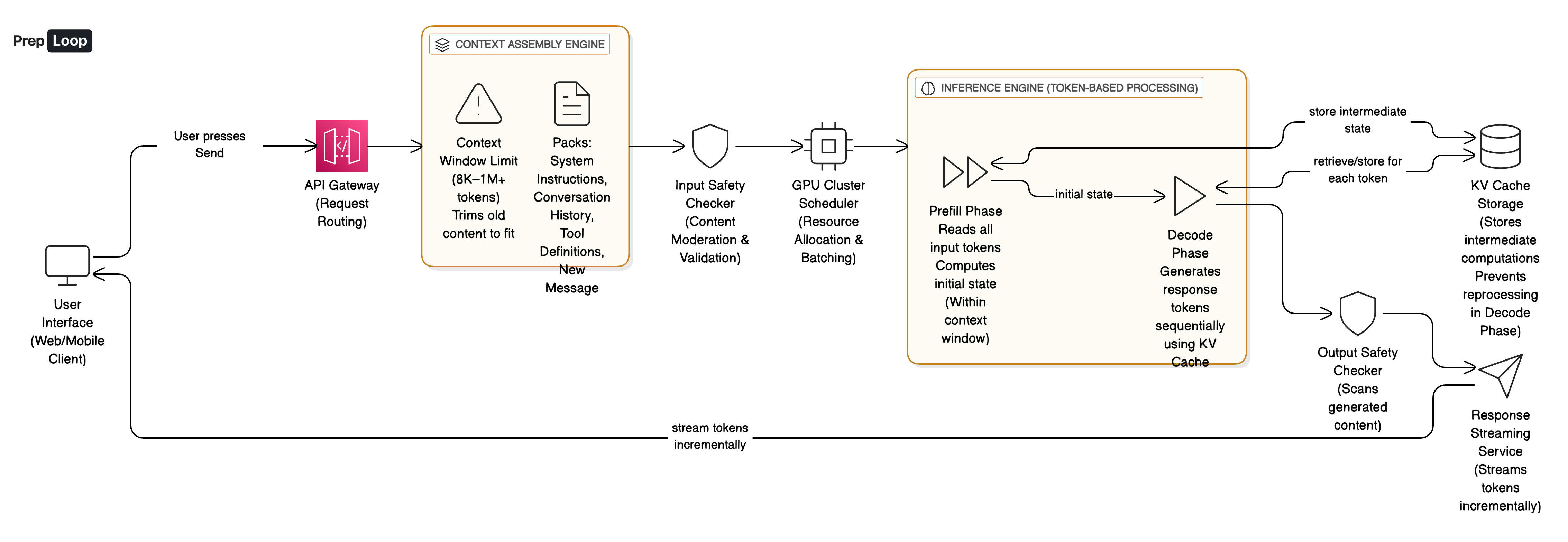 When you press Send, your message triggers a complex multi-stage process that transforms simple text into contextually aware responses. The system doesn’t just pass your question to a model and return an answer. Instead, it assembles context, validates safety constraints, manages computational resources, and carefully orchestrates the generation process across specialized hardware.