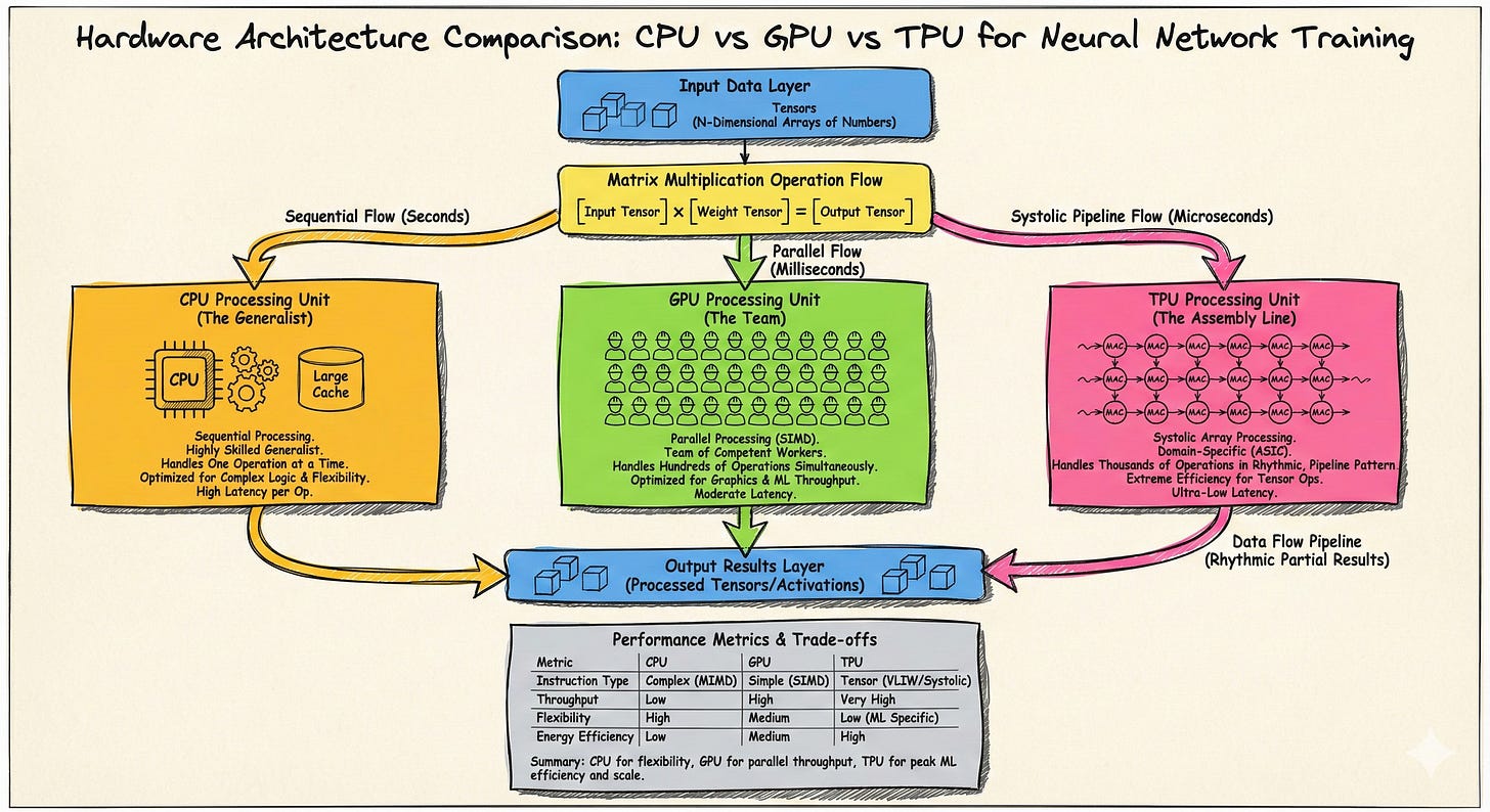 The lesson for engineers isn’t that TPUs are better or worse than GPUs. It’s that hardware architecture embodies assumptions about workloads. When you understand those assumptions, you can match your problem to the right hardware. When you don’t, you end up fighting the architecture instead of leveraging it.